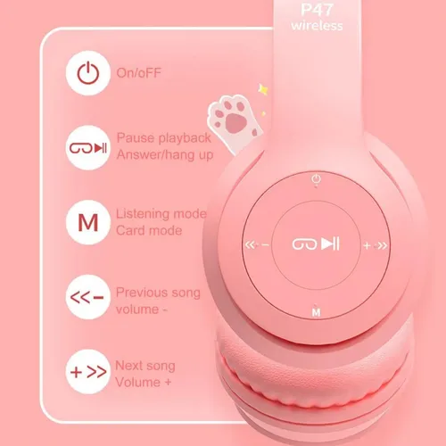 Novedosos y super Originales Auriculares Bluetooth con luz led brillante en las dos orejas de gato que tiene en la parte superior de la vincha. Tambien se pueden usar con cable auxiliar. Lleva estos auriculares para ser la estrella de la fiesta. Las luces de colores de los auriculares se pueden encender o apagar o parpadear con un botón. Además, las almohadillas suaves y acolchadas te ofrecen mayor comodidad cuando escuchas música durante mucho tiempo. Con sistema Plegable. Facil de transportar. Cuenta con Reducción de ruido que lo aisla completamente de las perturbaciones externas.