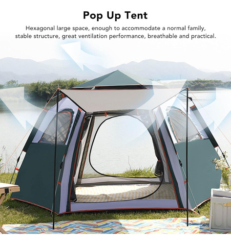Esta carpa Hexagonal Autoarmable para Camping cuenta con 2 (dos) Puertas Francesas y 4 (cuatro) Ventanas de Ventilación. Ademas posee un Techo de Rejilla que permite mejor Circulación del Aire en 360° mejorando el clima en epocas de calor.