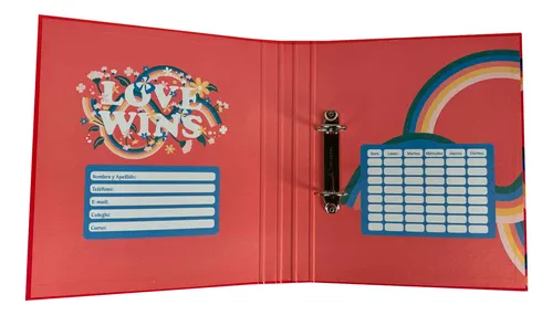 Está hecha de material de muy buena calidad y cuenta con los anillos para colocar hojas A4. Tiene dibujos tanto en la parte externa, como en la interna de la carpeta.
