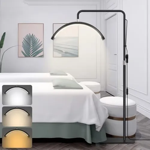 Diseño especial de forma de media luna con soporte de suelo, que te permitirá hacer tu trabajo sin ninguna obstrucción de sombra.