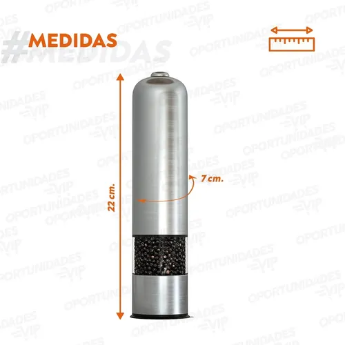 Novedoso molinillo eléctrico, elegante diseño en acero inoxidable para sal, pimienta, o cualquier especia que se desee moler. Perfecto para el uso de la cocina o la mesa, cuenta con un área de visualización transparente y una amoladora de cerámica de alta calidad. También posee una luz led inferior que le permite verter la cantidad correcta de condimento justo encima de la comida. Con un fácil empuje del botón superior, el trabajo de molienda está hecho.